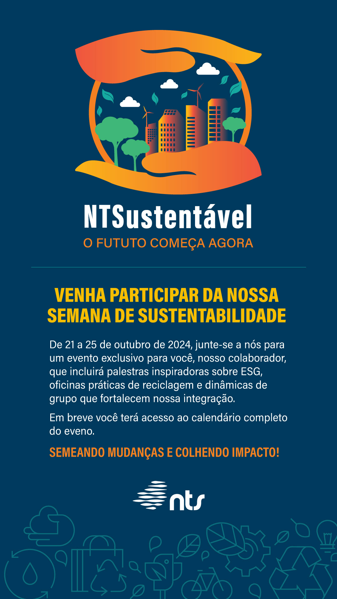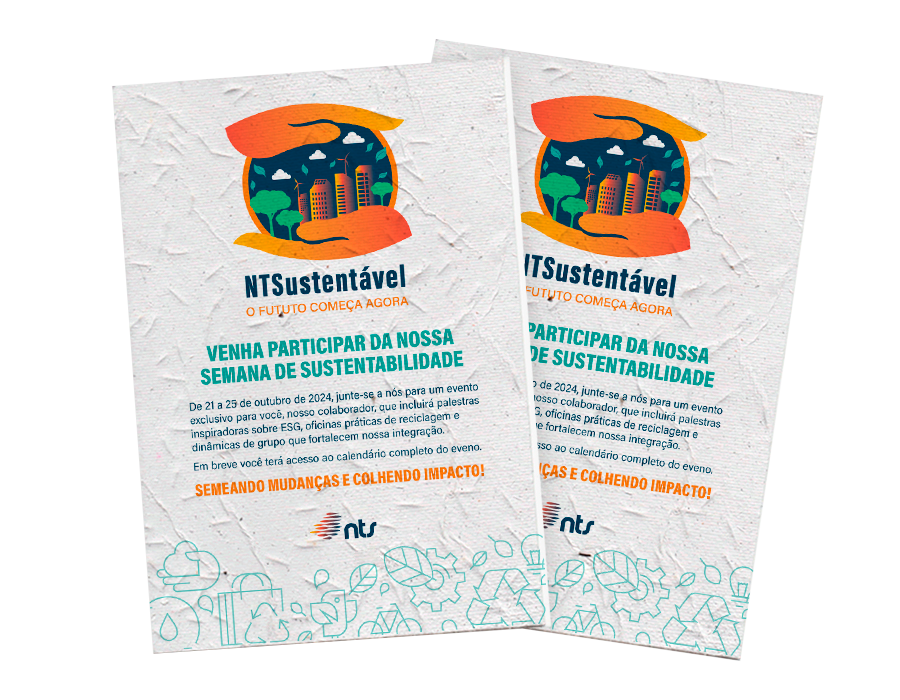 Criação da identidade visual, peças de comunicação e cenografia para o evento NTSustentável, da empresa NTS.