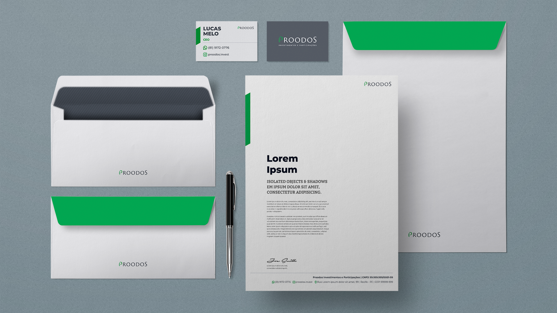 Criação de logotipo, identidade visual e peças de comunicação para a Proodos, holding de investimentos e participações.